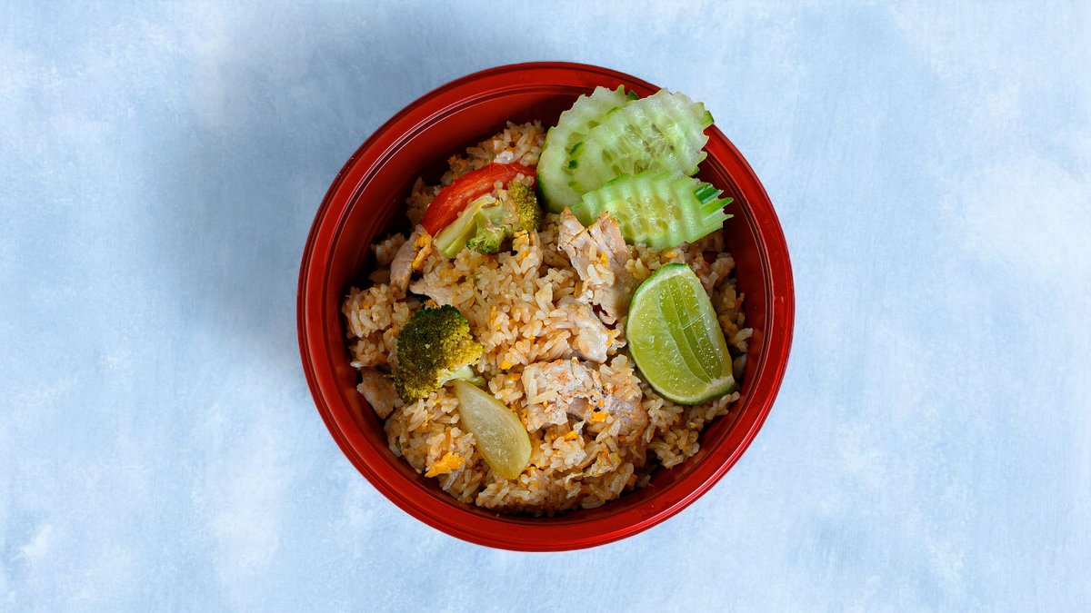 Stekt ris med kylling, reker, grønnsaker og egg.