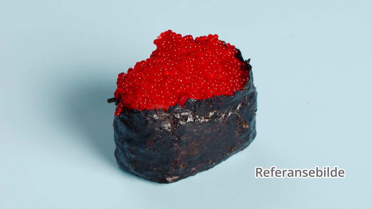 Rull med avokado og agurk. Toppet med lakserogn og chilimayo.