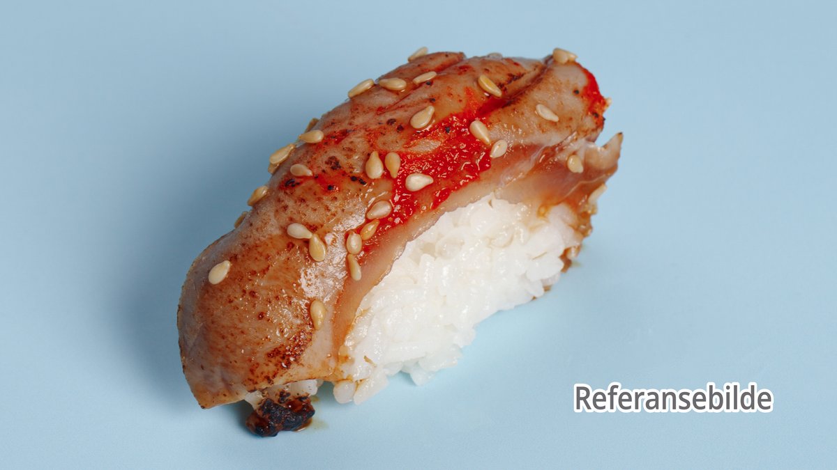 18 biter. 8 laks, 4 tuna, 3 scampi og 3 kamskjell.