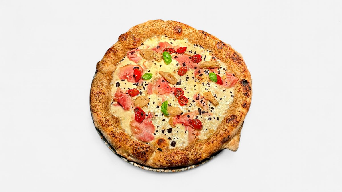 Villsoppkrem, Mozarella, Soltørkede tomater, Stavangerskinke, Fritert artisjokk, Tørket oliven og Basilikum
