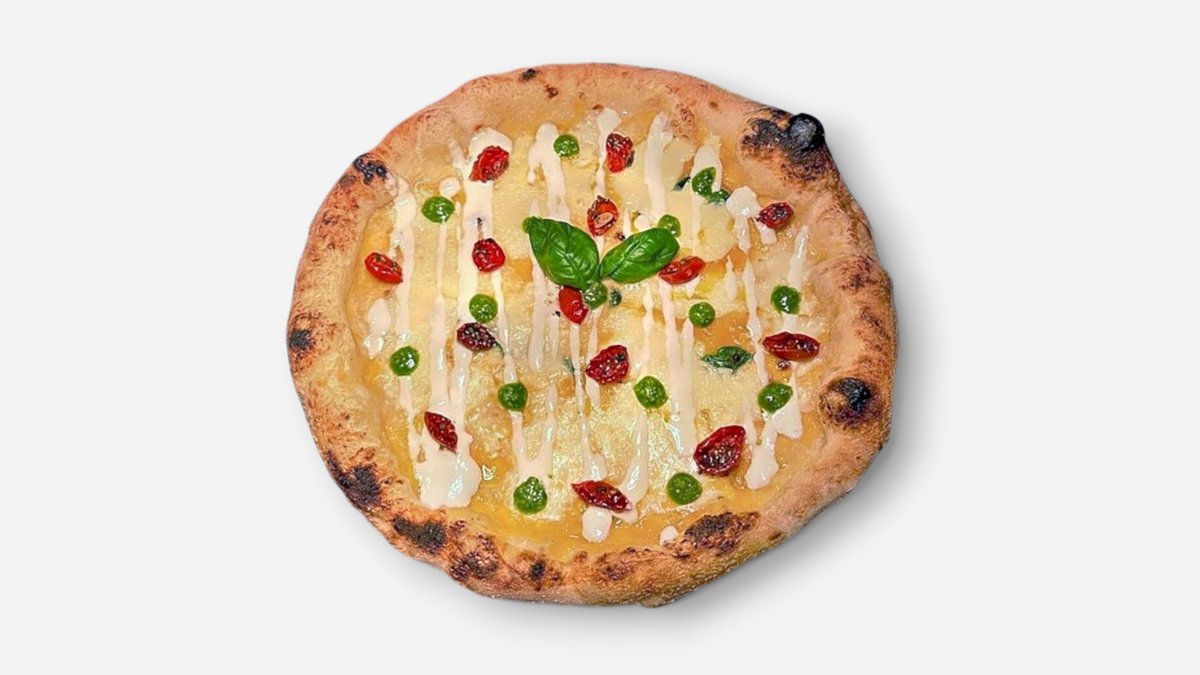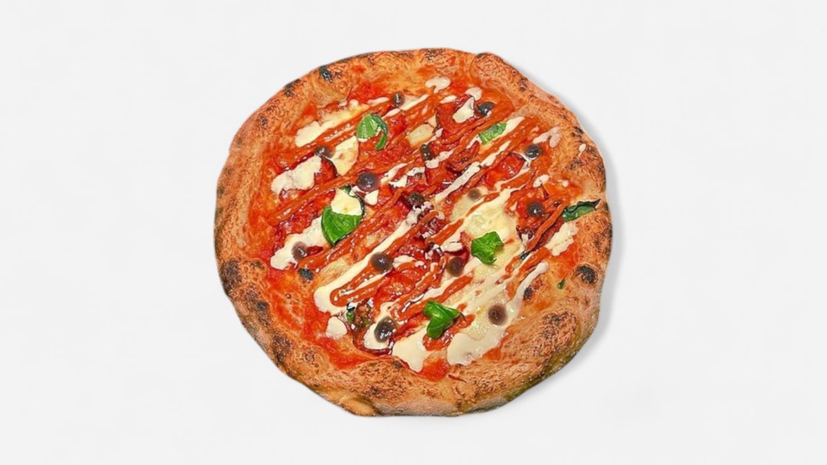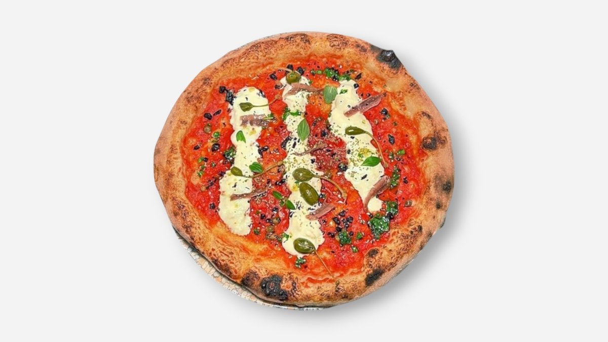 San Marzano-tomatsaus, Stracciatella, Kaperbær, Anchiovies, Oregano, Tørket Oliven og Gremolata