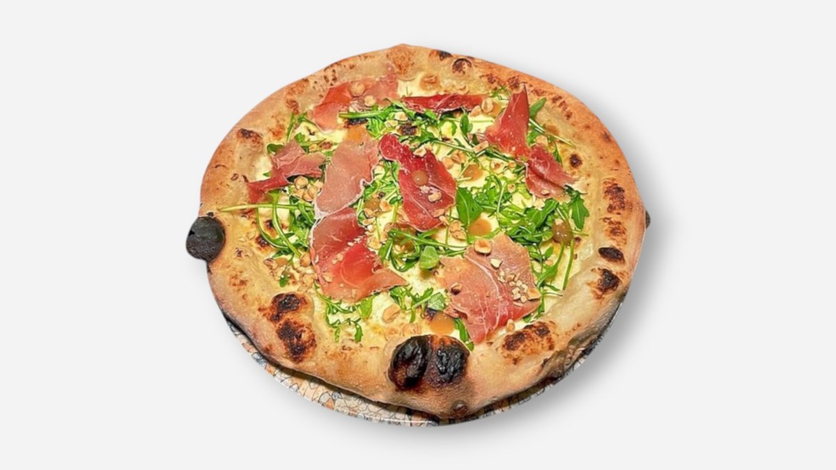 San marzano tomatsaus, Basililum, Mozarella, Spianata Salami, Nduja saus, løksyltetøy og Bøffelmozarella krem