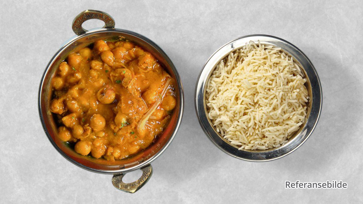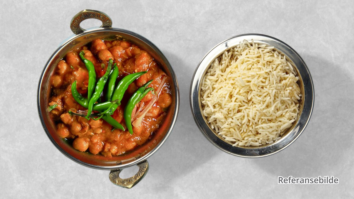 Kikerter putret med stekt løk, tomater, ingefær, hvitløk og krydder. Tilsatt rømme og servert varm pyntet med løkringer og grønn koriander.