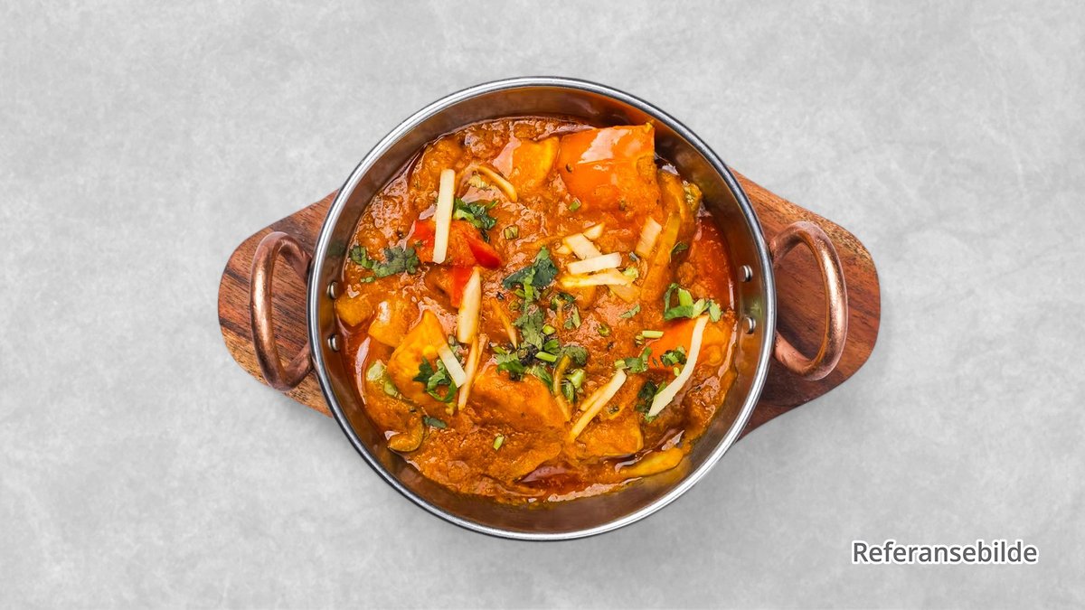 En varm saus laget av stekt løk, tomater, ingefær, hvitløk, cashewnøtter og fløte, toppet med fersk koriander.