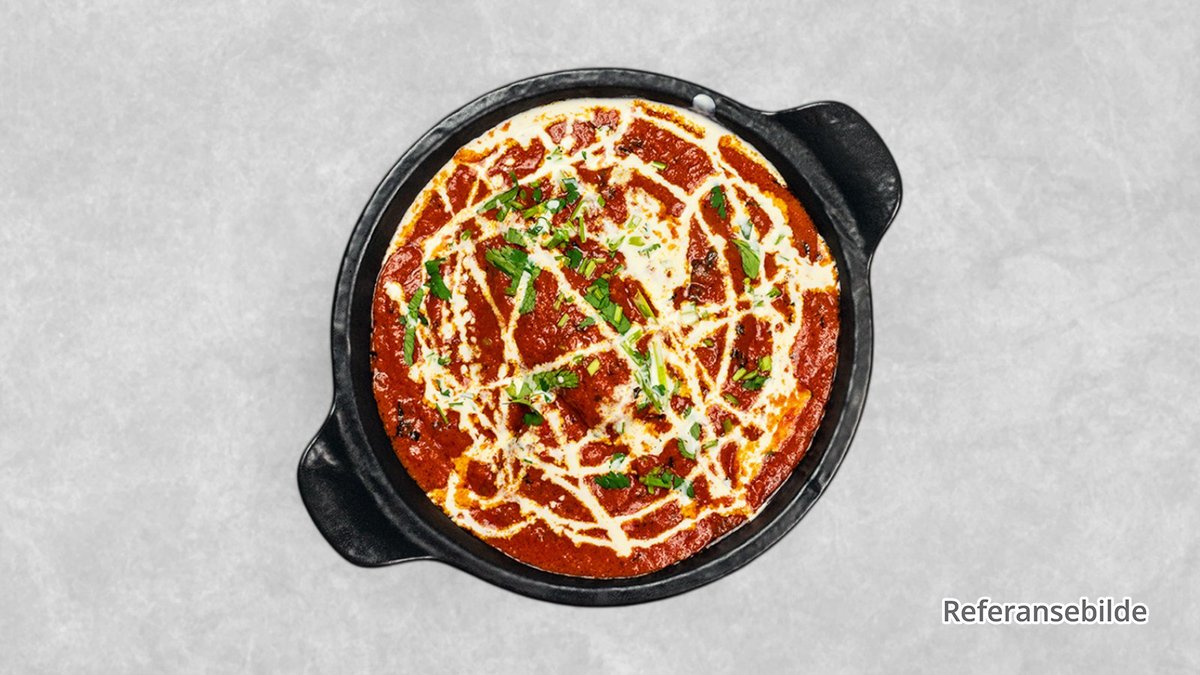 Benfri kylling marinert i krydder, grillet i Tandoor og putret i fyldig og jevn aromatisk saus tilberedt med malte tomater, cashewnøtter og løk, krydret og rullet i smør og fløte og toppet med fersk koriander. Kan ikke tilberedes uten cashewnøtter.