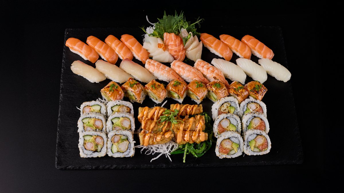 12 biter sashimi, 16 biter nigiri, 8 biter signatur maki, 12 biter futomaki, 6 biter tempurasalat. (54 biter assortert sushi - Passer til 3 pers). Kommer med 3 Soyasaus - 1 Jalapeñosaus - 1 Ponzusaus - Ingefær - Wasabi. Fisk kan variere.