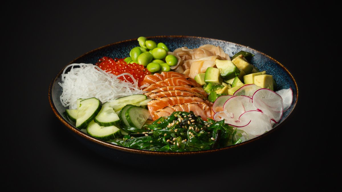 Japansk-inspirert bolle med flambert sashimi-laks, ris, yuzu-mayo, sjøgress, agurk, reddik, avokado, edamame og syltet ingefær. Yuzu dressing, sesamfrø og ikura på toppen.