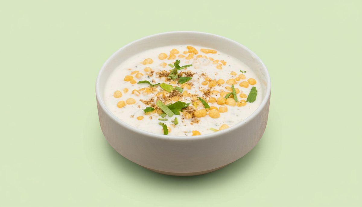 Benfritt lammegryte med ris, purreløk, cashewnøtter og rosiner. Serveres med raita.