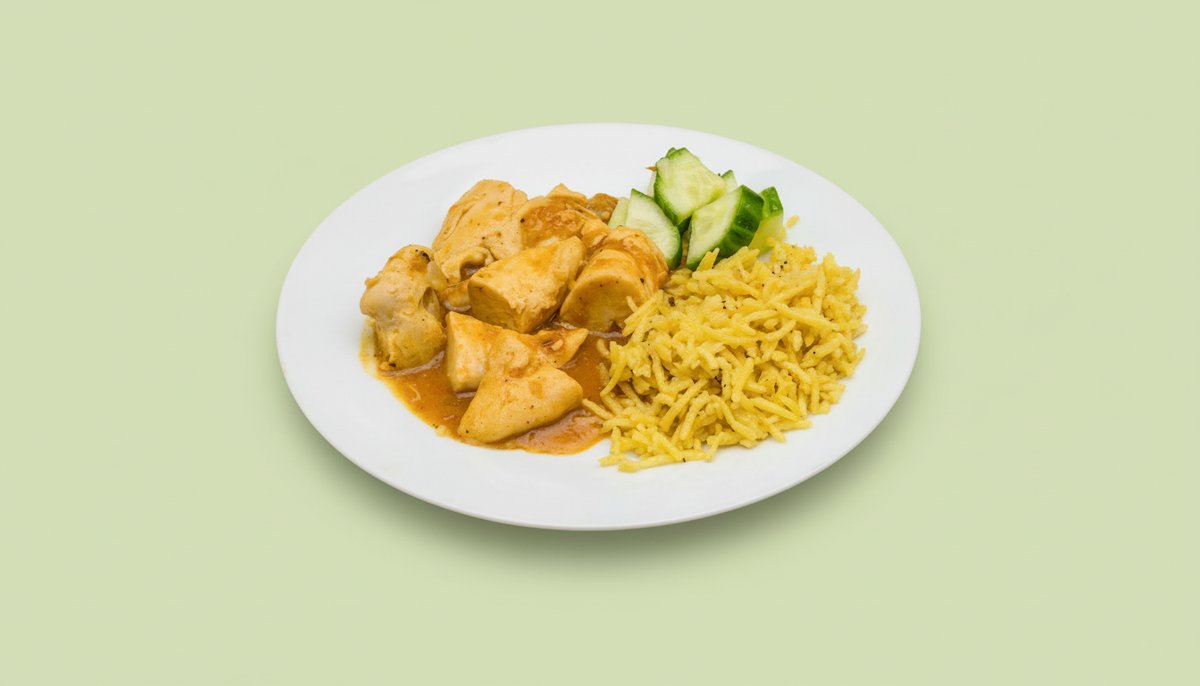 Benfri kyllinggryte med ris, purreløk, cashewnøtter og rosiner. Serveres med raita.