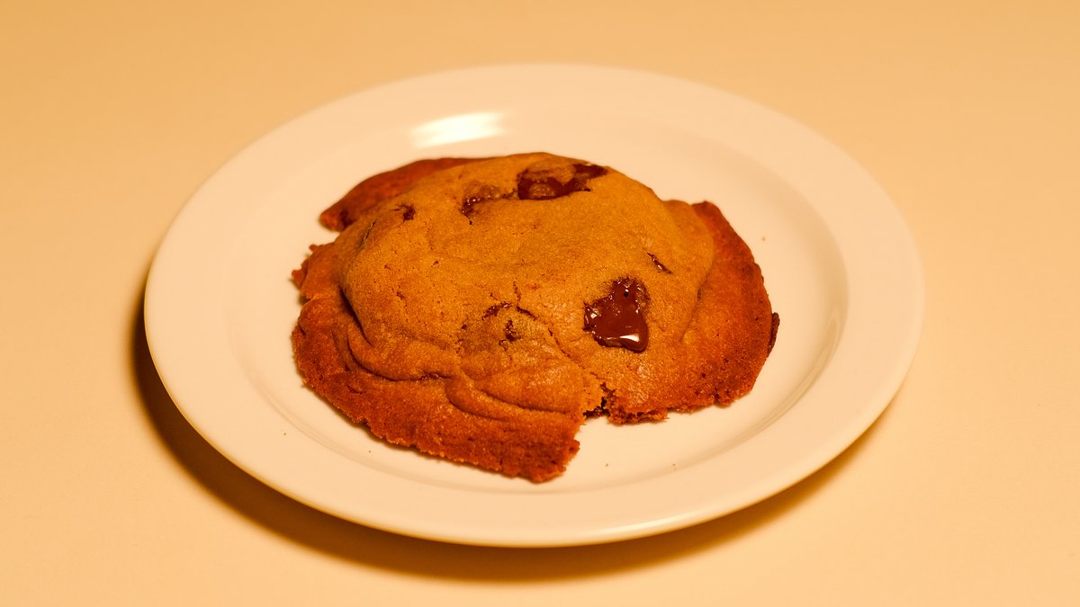 Hjemmelaget cookie med mørke sjokoladebiter. Anbefales å ha den litt i ovnen, da blir den myk i midten. Nam!