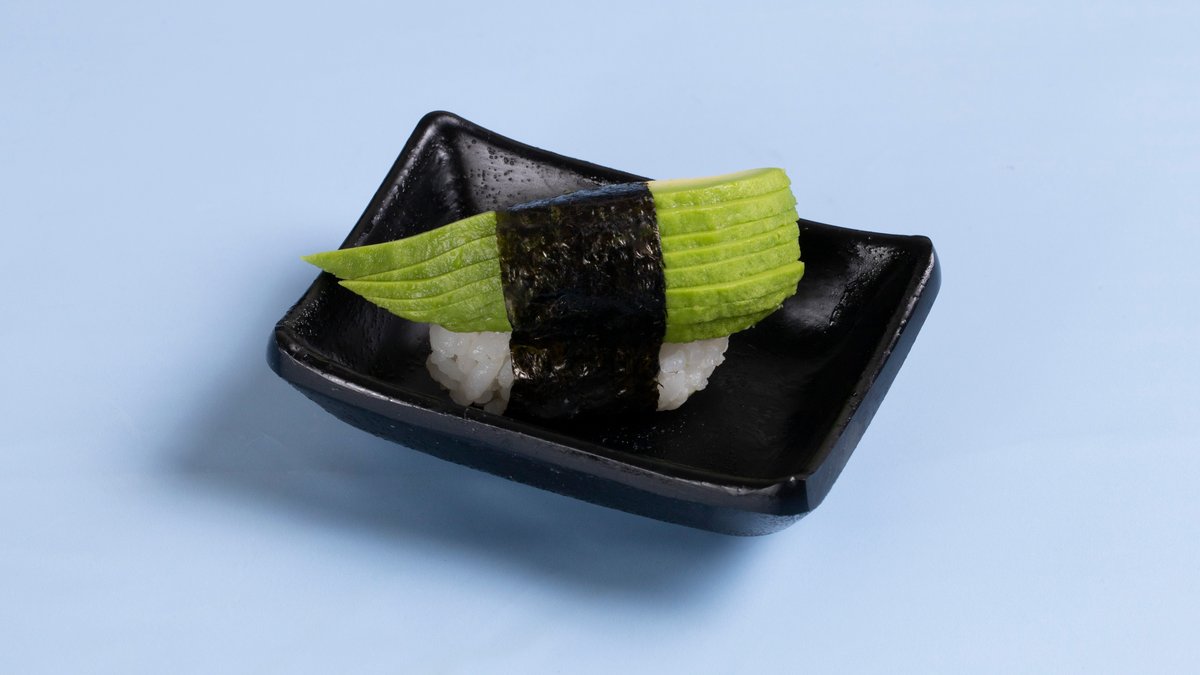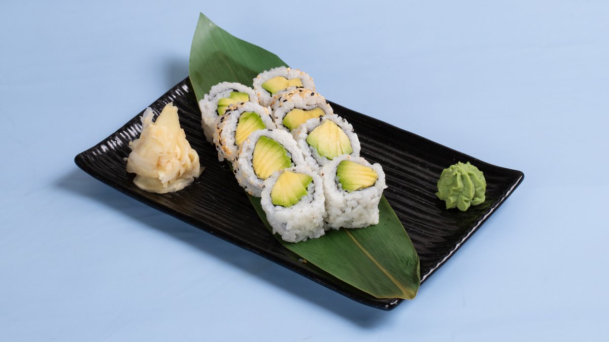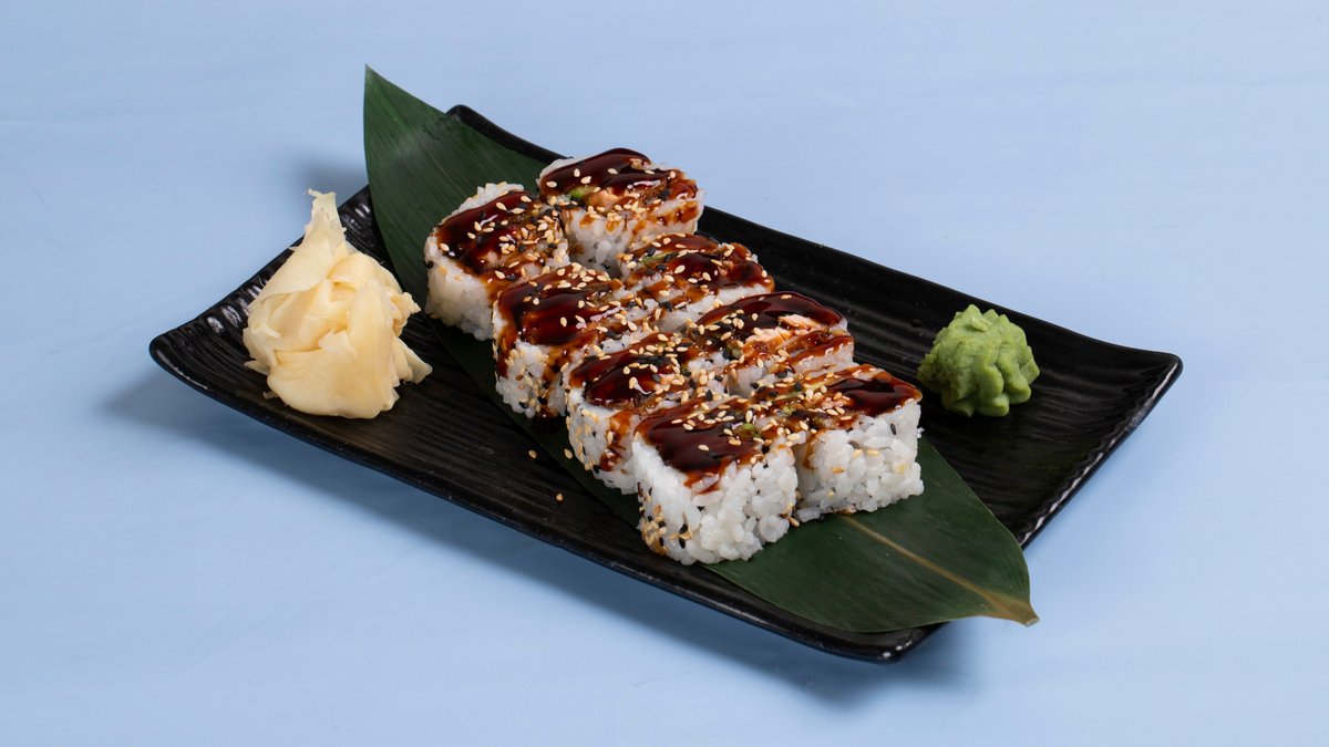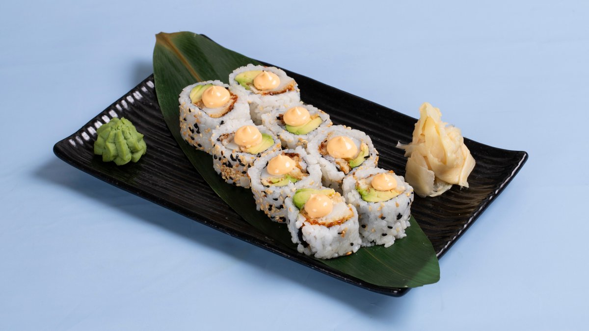 8 biter Fritert vegetar maki rull med forkjellig valg sammen med avocado. chilimajones og teriyaki oppå