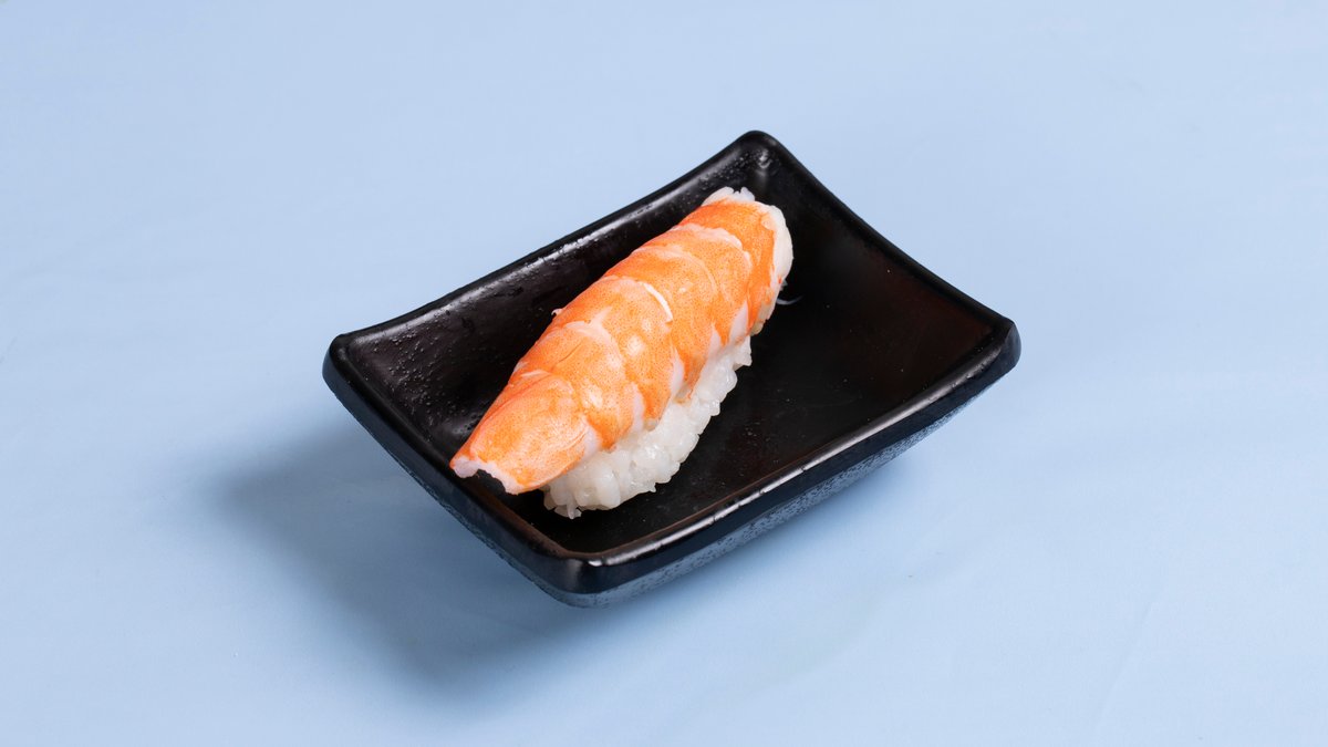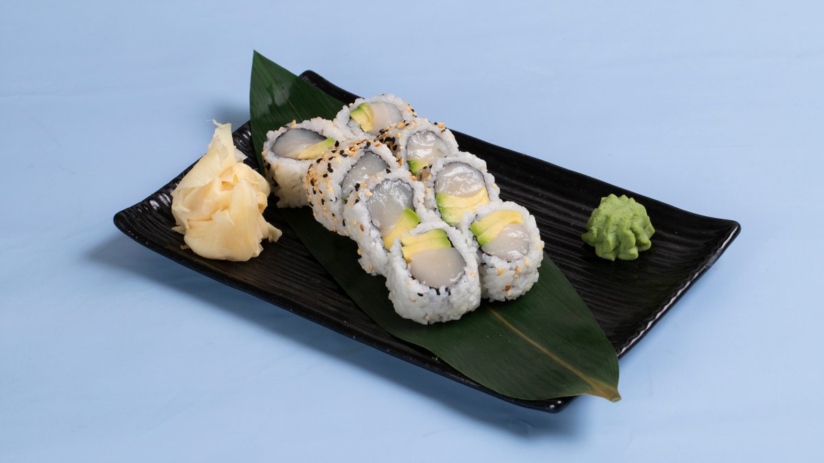 8 biter. Innbakt fritert scampi, laks, avocado, lakserogn, sesamfrø.