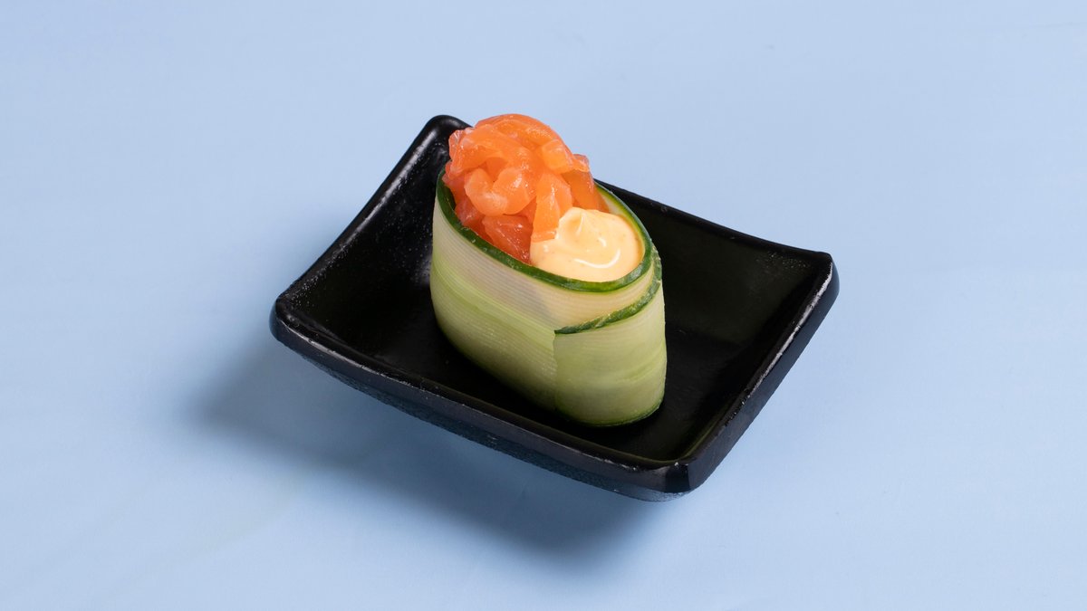 13 biter. Agurk, mango, avokado, sesamfrø og chilimajones.