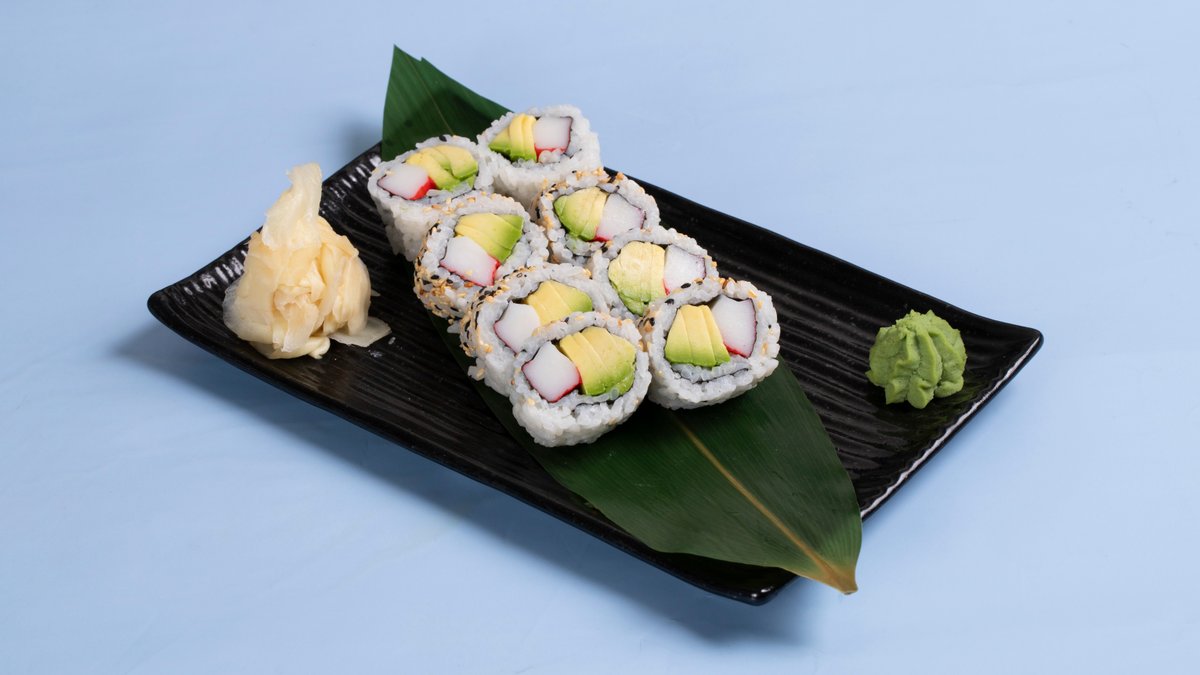 6 biter. Velg mellom kylling/laks/scampi/crabstick. Med avokado, chilimajones og sesamfrø.