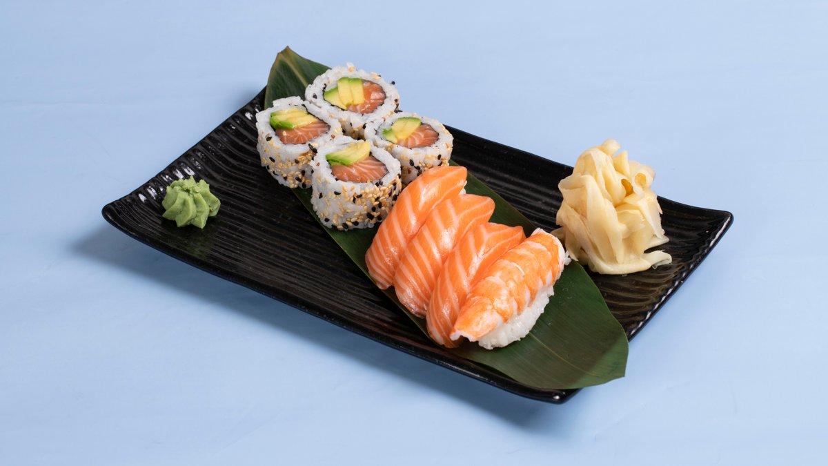 20 biter. 6 laks, 2 tunfisk, 2 scampi, 1 kveite, 1 kamskjell og 8 tempura maki med avokado og sesamfrø.