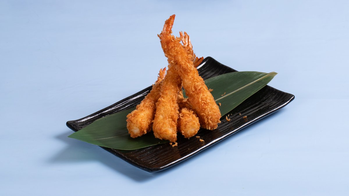 13 biter. Innbakt fritert scampi med avokado, chilimajones og sesamfrø.