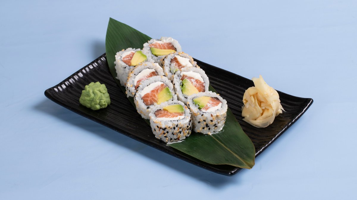 8 biter. Velg mellom innbakt fritert avokado/søtpotet eller tofu med philadelphia ost, avocado og teriyaki saus med sesamfrø.