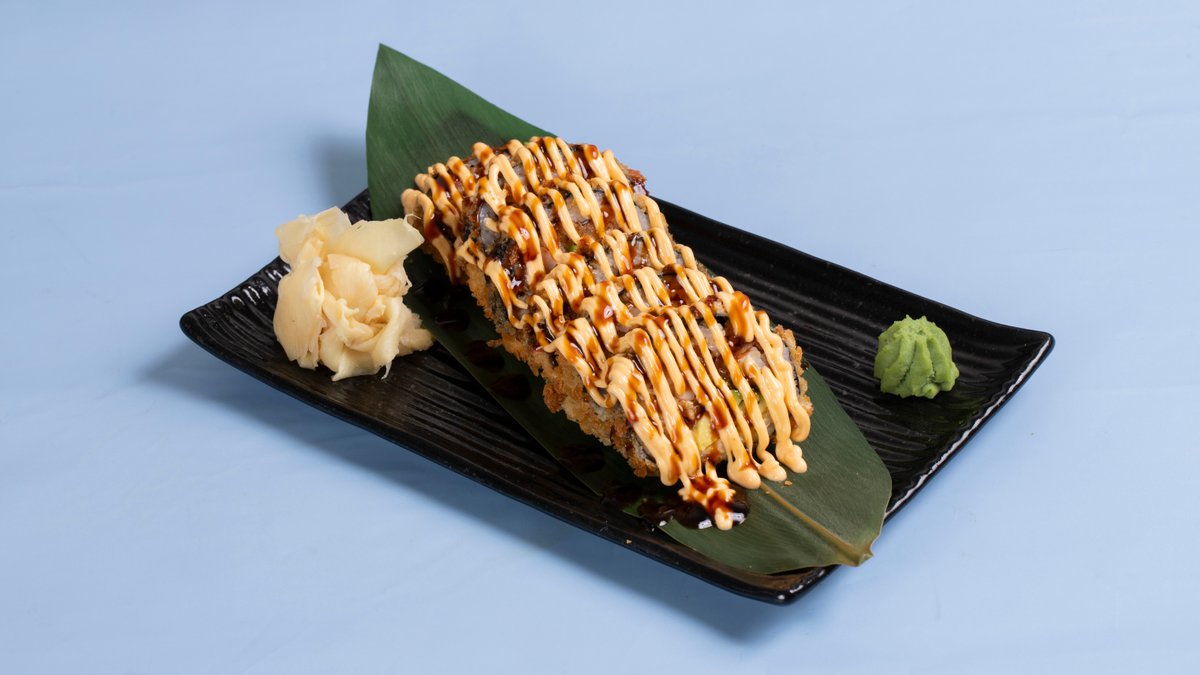 8 biter fritert maki rull med forkjellig valg sammen med avokado, sesamfrø, chilimajones og teriyaki oppå. !Hvis dere velger "kuttet" blir den 8 biter, men hvis dere velger "ikke kuttet" får dere chilimajones og teriyaki ved siden av.