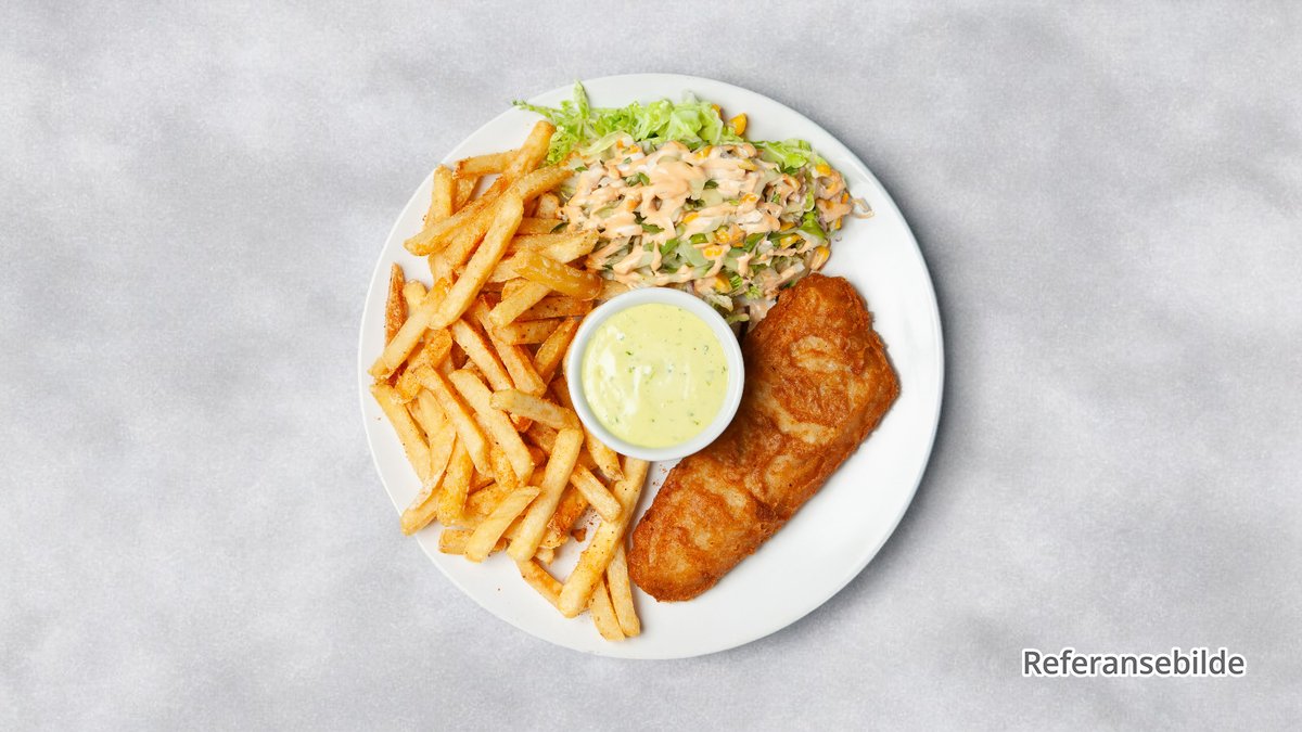 Fiskeburgertallerken med salat, grønnsaker og dressing. Serveres med fries.
