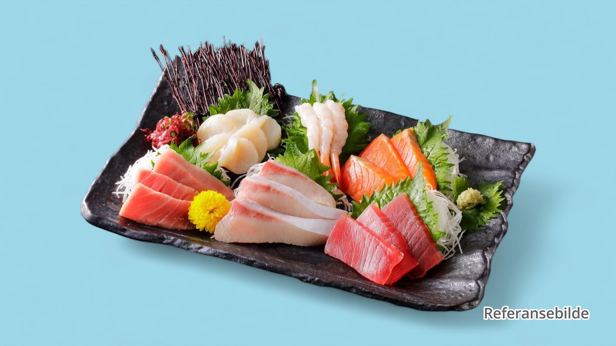 15 biter assortert sashimi. Tuna, kveite, scampi, kamskjell og mest laks. Serveres med ris og salat.