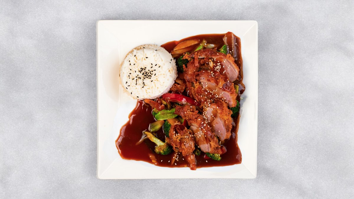 Crispy og saftige andebryst i hjemmelaget hoisinsaus. Wokket sammen med ferske grønnsaker og ris.