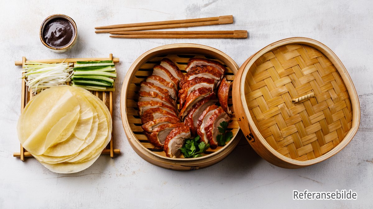 Sprøstekt and servert med madarin pancakes, hoisinsaus og grønnsaker.