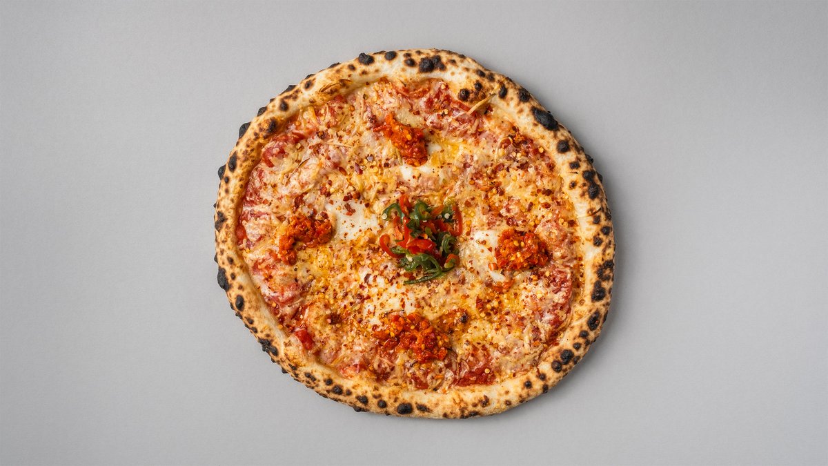 Tomatsaus, 36-måneder gouda, røkt raclette, taleggio, syltet chili, tørket chili og most calabrisk chili.