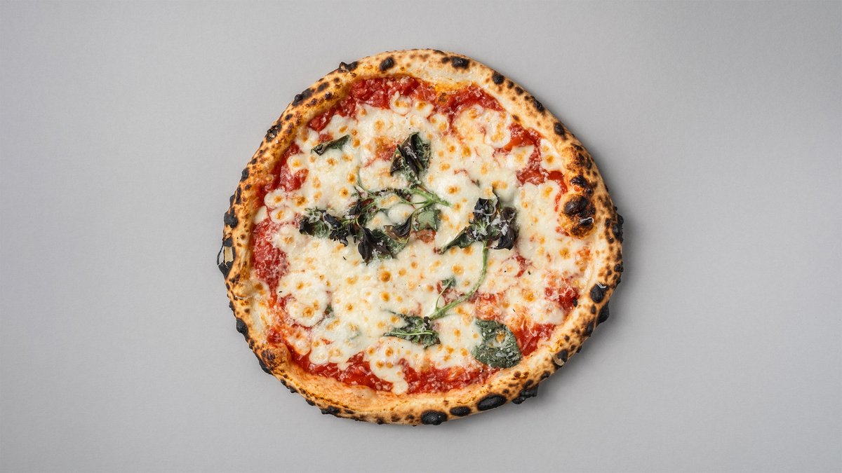 Tomatsaus, mozzarella, basilikum, olivenolje og 24-måneders parmesan.
