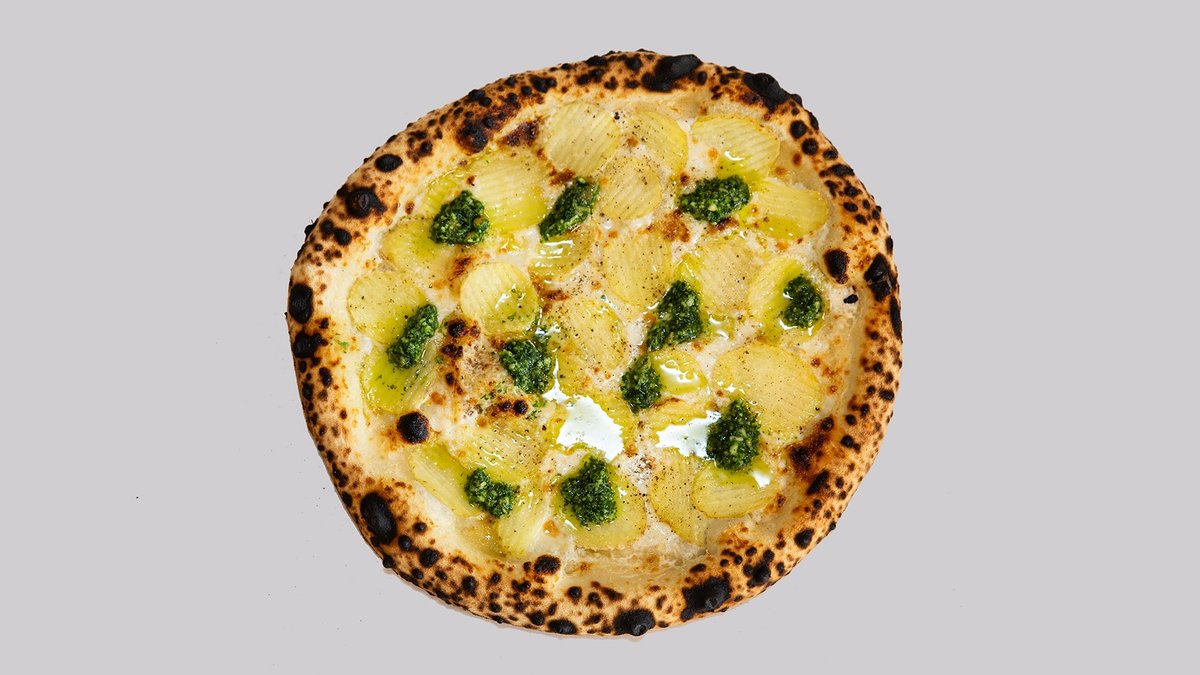 Mascarponekrem, mozzarella, pecorino, nypotet og løpstikkepesto.