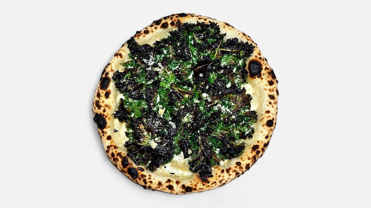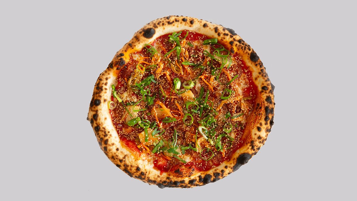 Tomatsaus, braisert oksehale, gochujang, mozzarella, ristet sesam og kimchi.