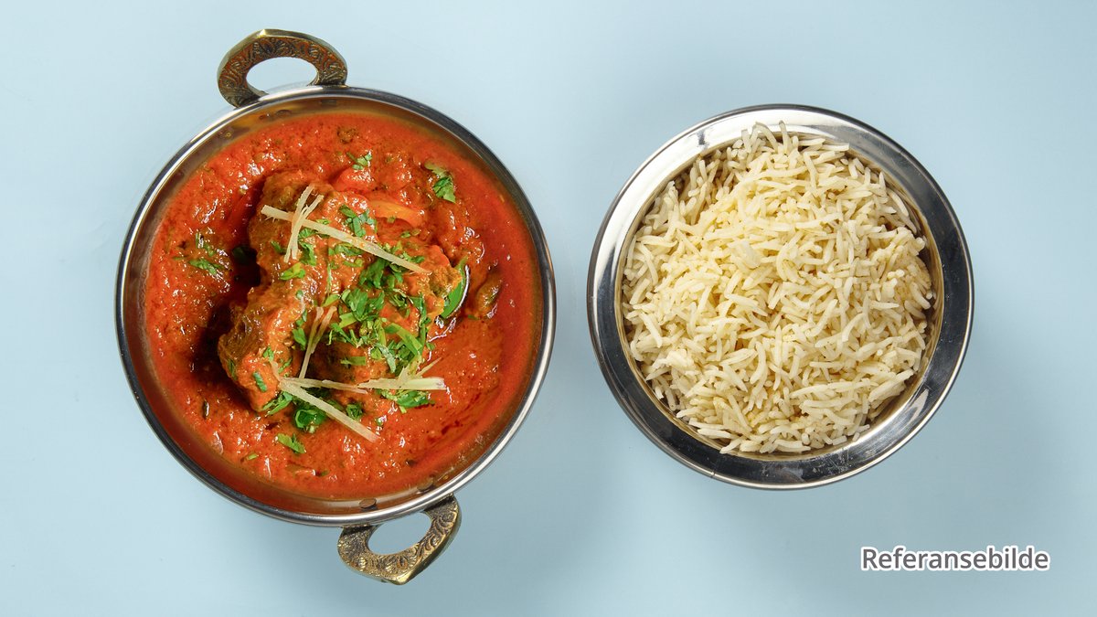 Lammekjøtt tilberedt med krem, ferske korianderblad, flerkrydder, bukkehorn, ferske tomater, hvitløk og ingefær.