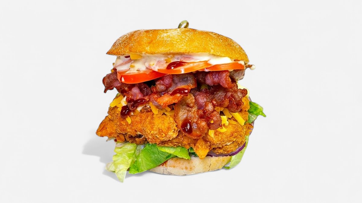 Nydelig Bacon Burger med saftige kyllingstrips, sprøstekt bacon og rik BBQ-saus. Perfekt sandwich til enhver tid. Stekt bacon, sprø kyllingstrimler, salat, cheddarost, rødløk, tomat, bbq saus