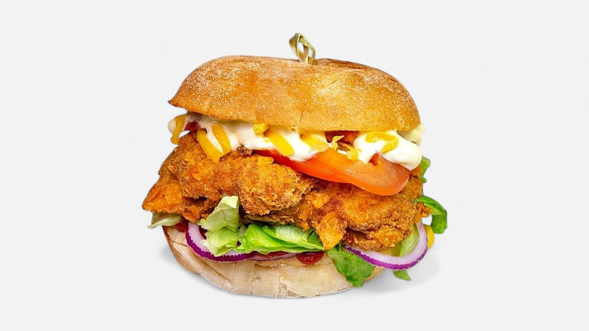 Nyt vår saftige Kylling Burger! Laget med fersk kylling, toppet med ketchup, salat og tomat. Perfekt for sandwich-elskere. Sprøstekt kyllingstrimler, salat, tomat, rødløk, majonessaus, ketchup, cheddar ost