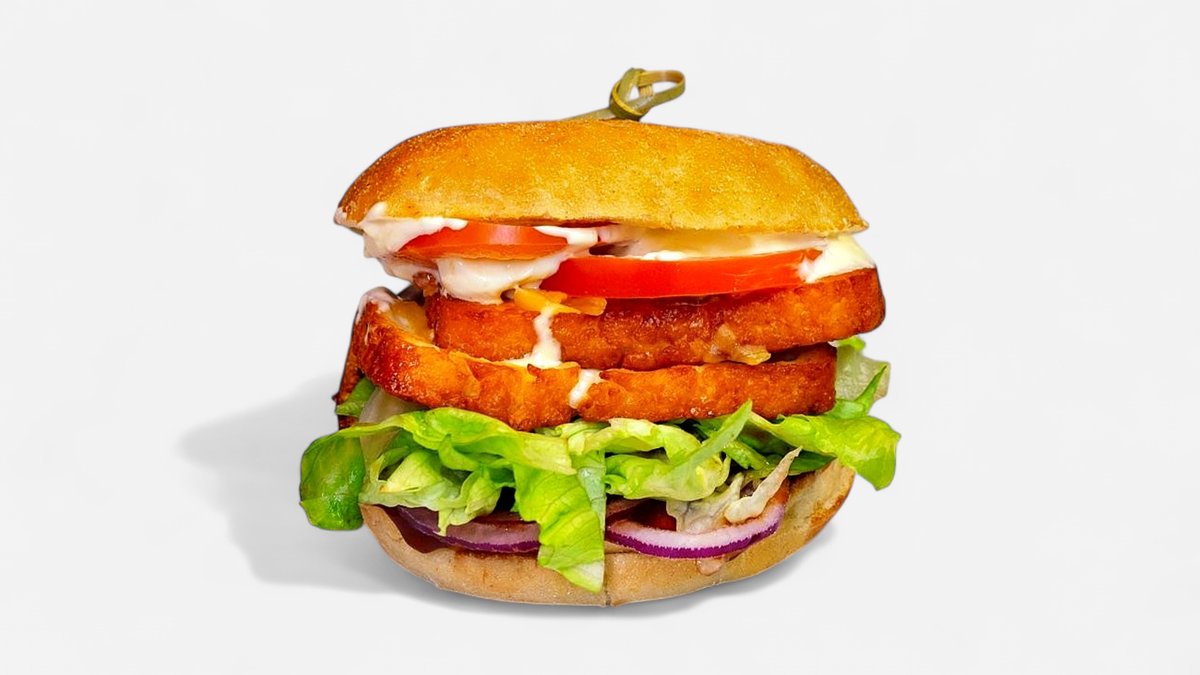 Nyt en deilig Halloumi Burger! Denne sandwichen inneholder grillet halloumi, friske tomater, sprø rød løk og smakfull BBQ-saus. Stekt halloumi ost, salat, rødløk, tomat, bbq saus, majones saus