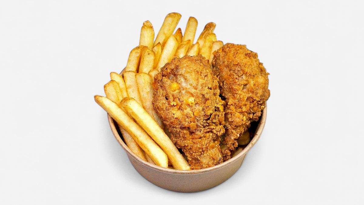 2 stykker kyllingklubber og pommes frites. Husk å bestille et saus til denne retten