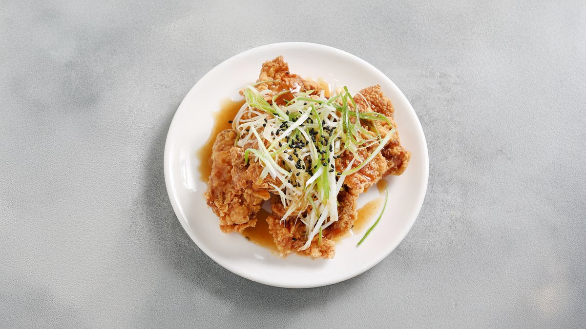 Crispy og saftig frittert lårfillet med The K-chicken`s egen soyabaserte wasabi saus og strimlet vårløk.