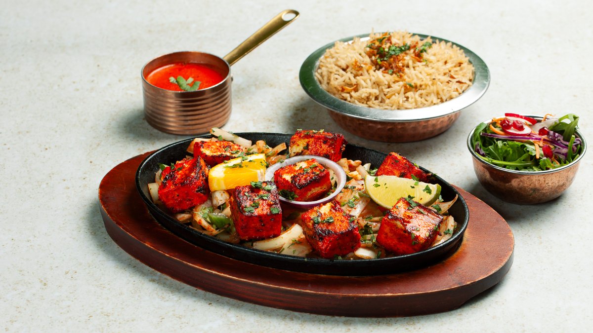 En mild klassiker. Grillede biter av marinert kylling tikka eller paneer blandet i en fløyelsaktig glatt tomat- og løkbasert smørsaus.