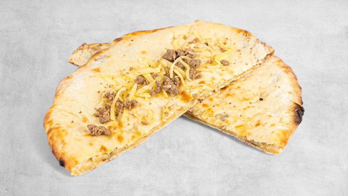 Naan fylt med ost, krydret kjøttdeig og hvitløkssmør.