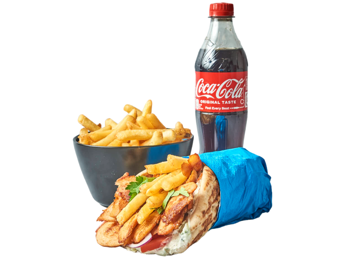Valg av pita gyros med ekstra pommes frites på siden og valgfri drikke.