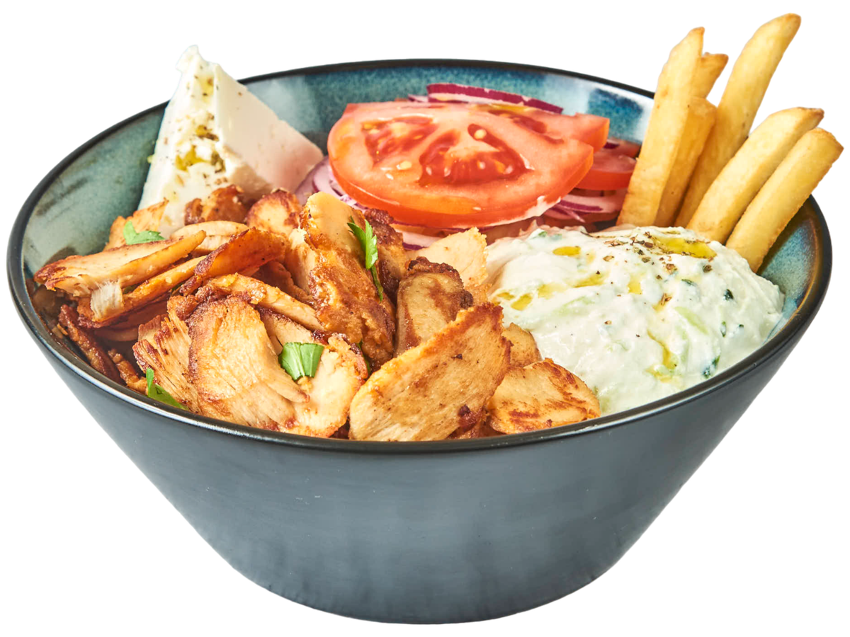 Valg av kjøtt eller vegetar over pommes frites, med tomater, rødløk, tzatziki og fetaost.