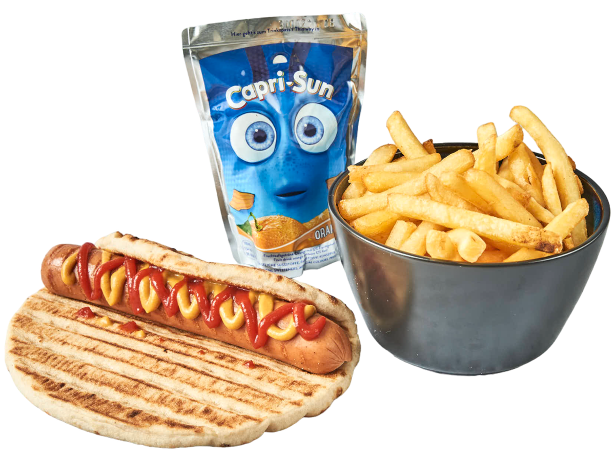 Pølser i et gresk pitabrød med pommes frites og Capri-sonne.