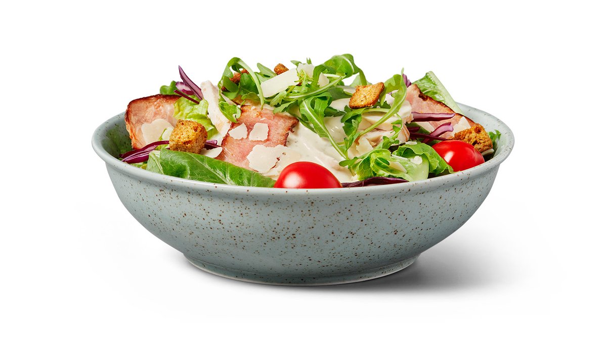 Vår variant av den klassiske Cæsar-salat med lokalt produsert kylling. Serveres med krutonger