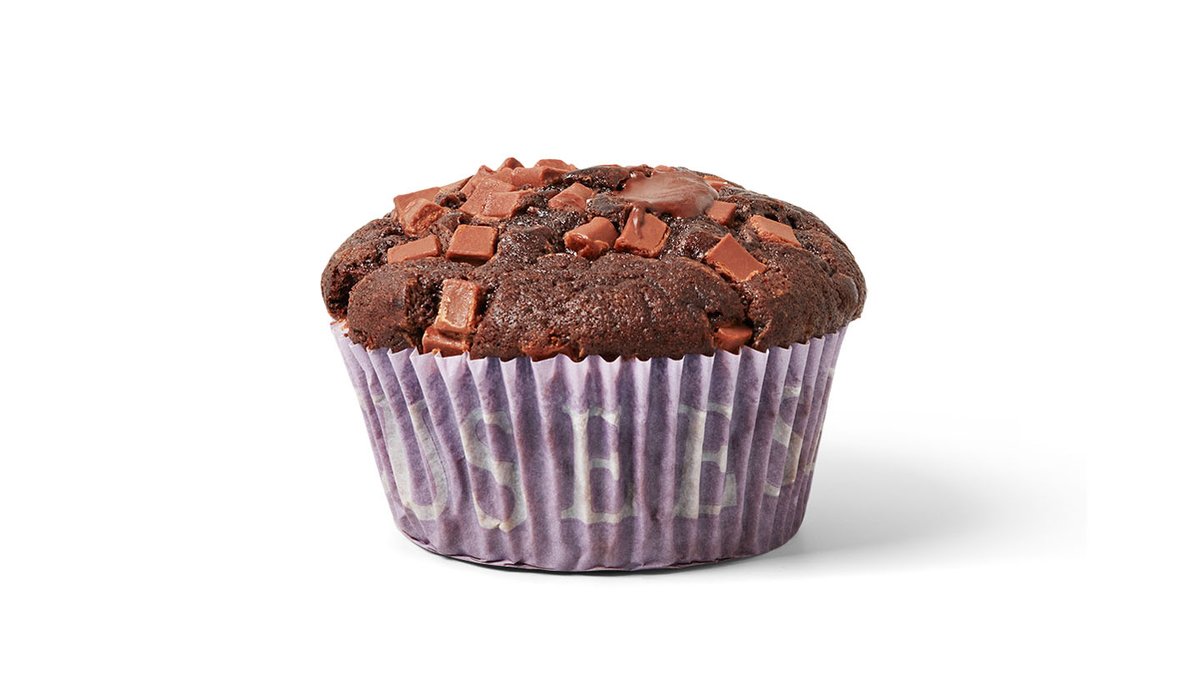 Sjokolademuffins fylt med sjokoladebiter og trøffel. Toppet med melkesjokoladebiter.