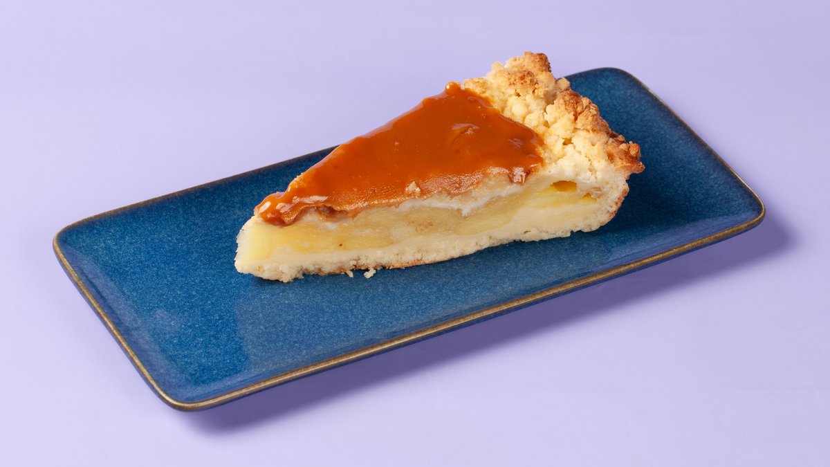 Et stykke eple- og karamellkake.
