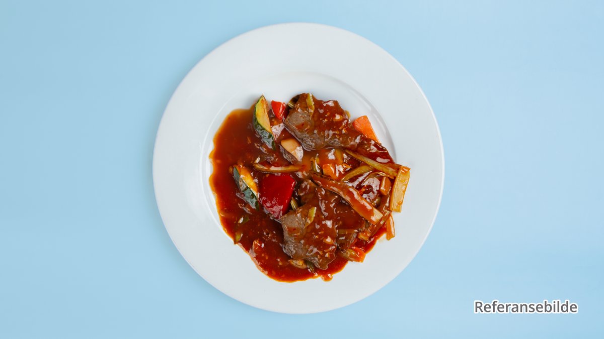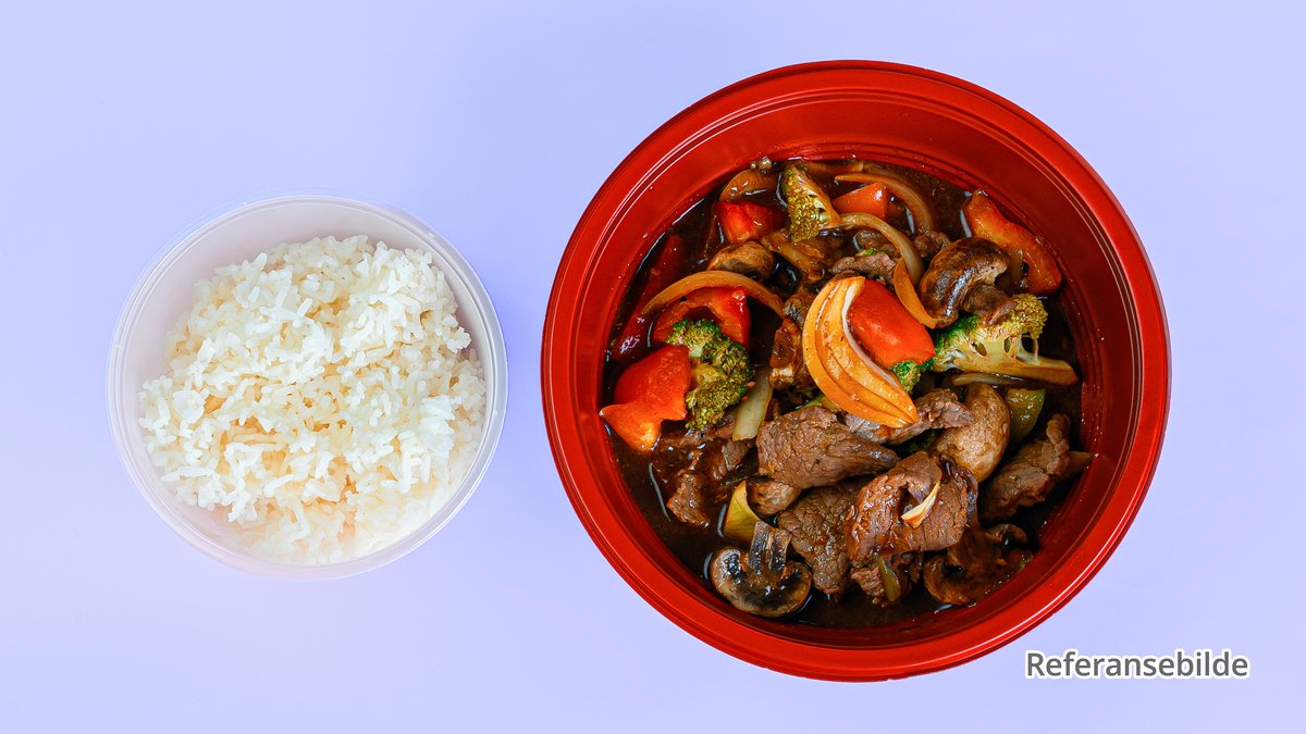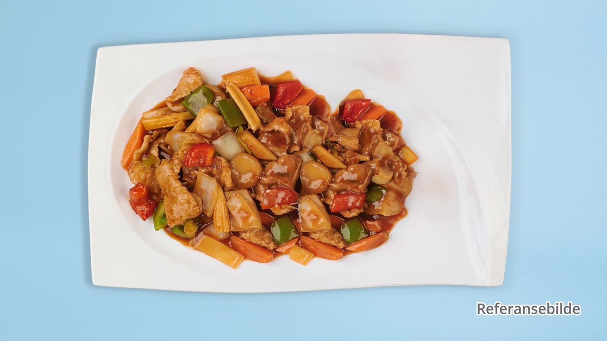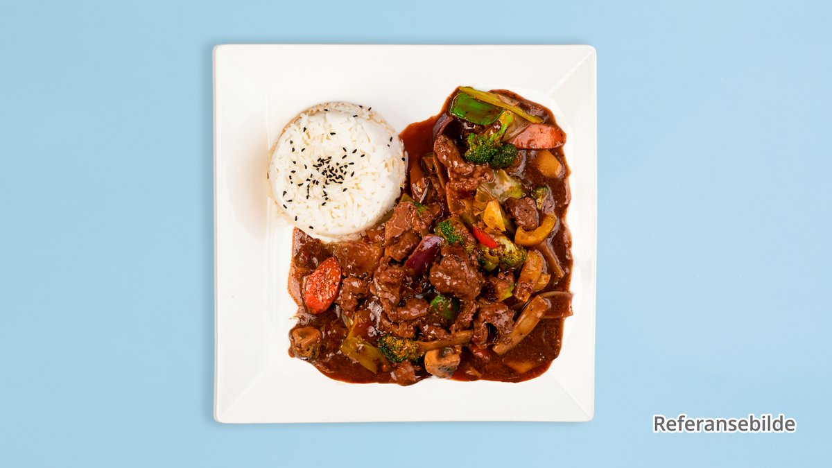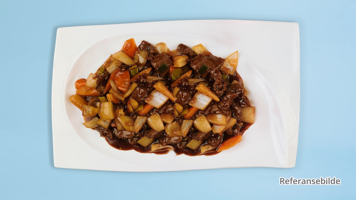 Biff Chopsuey med wok-grønnsaker og biff.