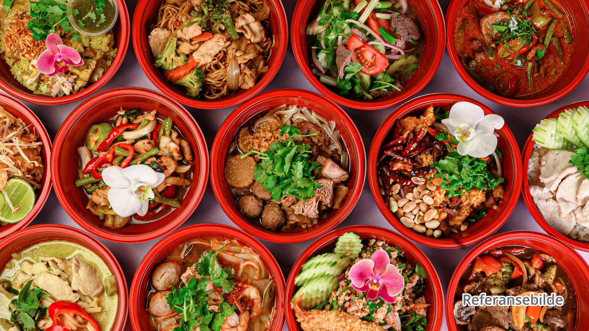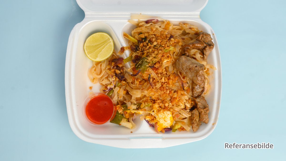 Pad thai med stekt nudler, kylling, biff og kongereker.