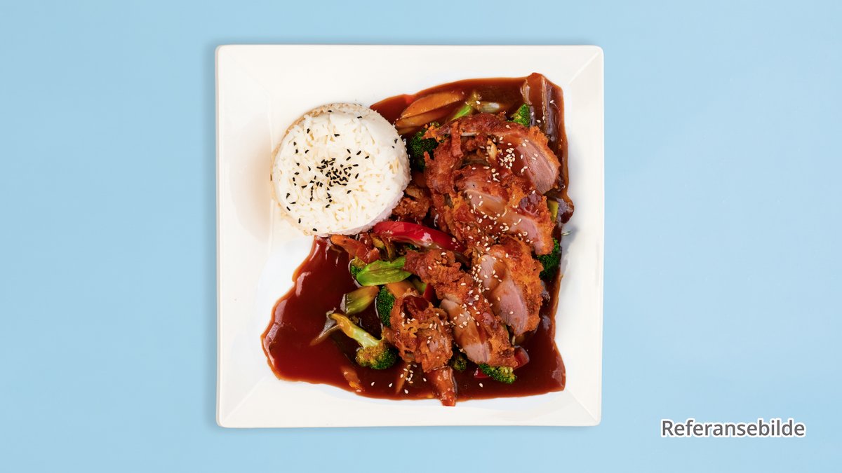Frityrstekt kylling med sursøt saus.