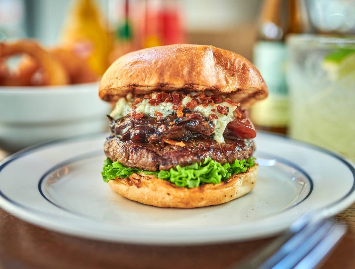 Storfeburger med blåmuggost, baconbiter, grillet og røkt rødløk og salat. Med Døgnvills burgersaus
