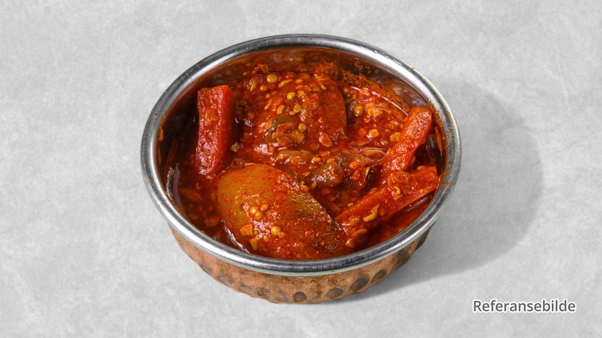 Tomatsaus, frityrstekt paprika, løk, sør-indisk krydder, limejuice og koriander.