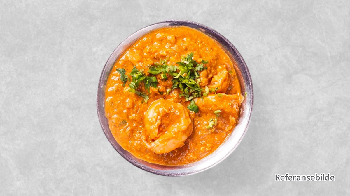 Store reker, champignon, ananas og karrisaus. Serveres med ris.